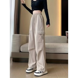 Ruched Solid Cargo Pants, Elegant High Waist Drawstring Pants With Pockets, Women's Clothing